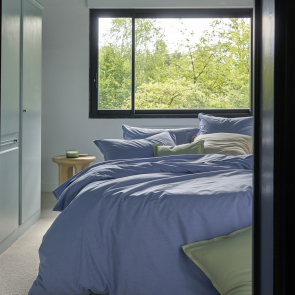 Housse de couette avec finition bouteille qui permet de border la housse au bout du lit grâce à son rabat à l'extrémité.